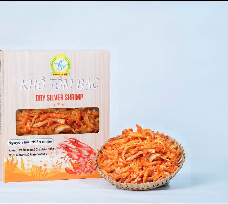 Từ truyền thống làm bánh phồng của gia đình, chúng tôi đã không ngừng sáng tạo tìm ra công thức sản xuất Tôm khô bạc Nông Sản Việt từ giống tôm bạc tự nhiên. Tôm bạc sống đem đi luộc, phơi, bóc vỏ. Lúc luột nêm muối, dằn muối vào tôm để tôm giữ được vị ngọt. Sau đó đem đi phơi dưới nắng tốt (trên 30 độ C). Vào ngày nắng giòn, ai có dịp đi qua xứ cơ cầu sẽ nhớ mãi hương tôm làm xiu lòng thực khách.